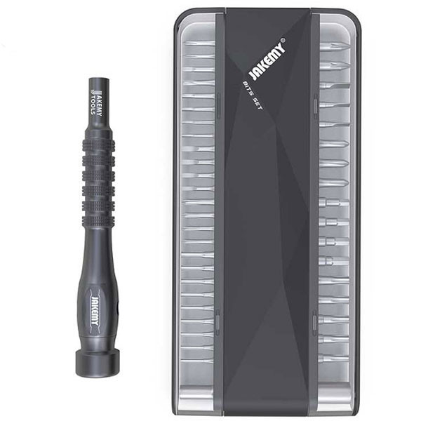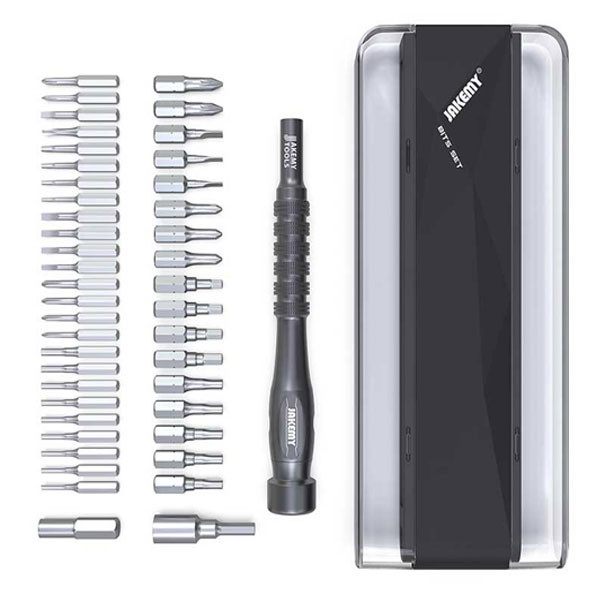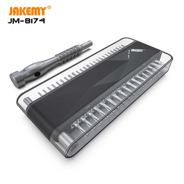 پیچ گوشتی JM-8174 با انعطاف پذیری بالا مجموعه 45 عددی پیچ گوشتی و ابزار کمکی است که به شما در انجام کارهای تعمیر و نگهداری کمک می کند. از پیچ گوشتی جاک می می توان برای تعمیر و جداسازی محصولات دیجیتالی دقیق و.... استفاده کرد. این محصول دارای 42 نوع سری باکیفیت و استحکام بالا، با سوکت های دو طرفه برای تعویض میباشد. دسته پیچ گوشتی Jakemy JM-8174 بدون لغزش و درپوش دم بلبرینگ 360 خاموش طراحی شده است. مغناطیس داخل دسته می تواند به سری ها منتقل شود، که می تواند پیچ های برداشته شده را به راحتی بگیرد.