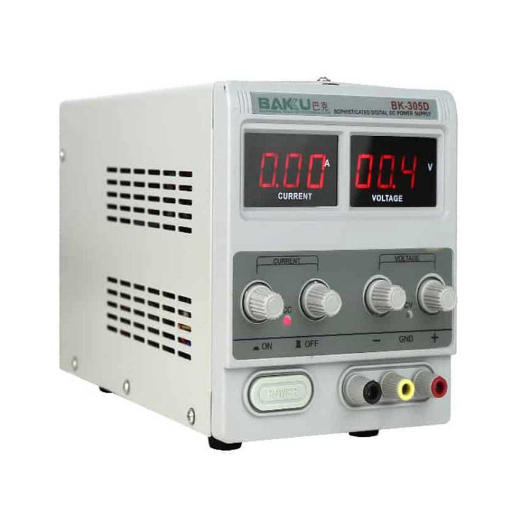 منبع تغذیه 30 ولت 5 آمپر باکو BK-305D ابزاری کاربردی در تعمیرات الکترونیک و موبایل است. موارد استفاده منبع تغذیه : با استفاده از این منبع تغذیه میتوان انواع گوشیهای موبایل، انواع تبلت، ECU خودرو و انواع لپتاپ و سایر دستگاهها را روشن و تست نمود.