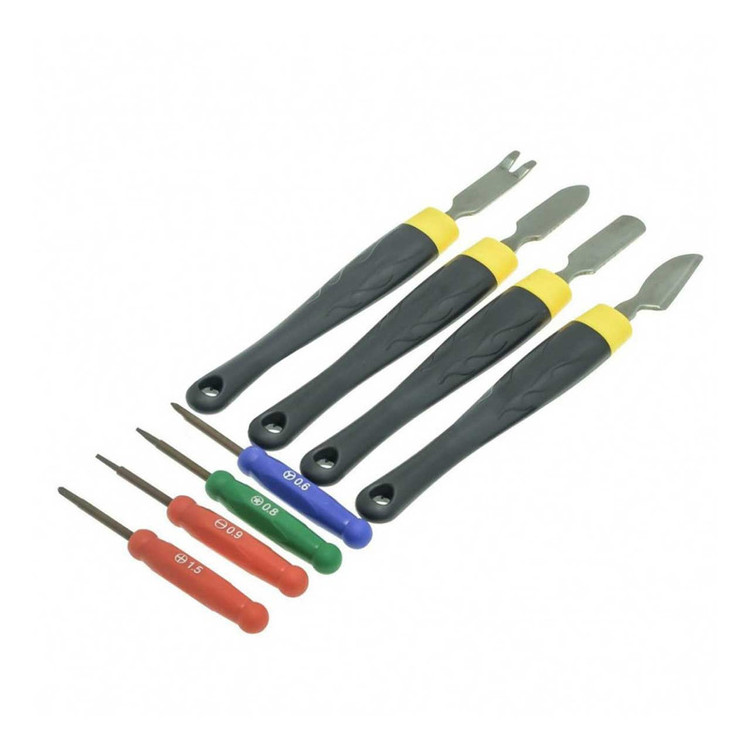 این مجموعه8تیکه شامل 4 اسپاتول استیل یک عدد پیچ گوشتی ستاره ای 0.8 ، یک عدد دوسو 0.9 ، یک عدد چهارسو 1.5 و یک عدد سه پر 0.6