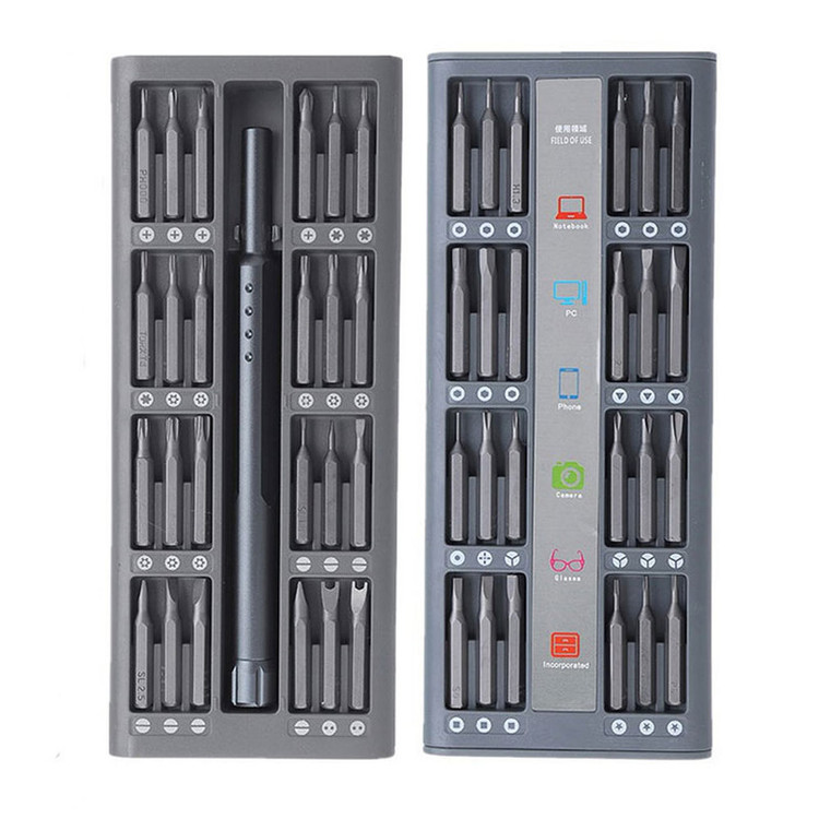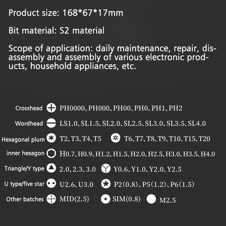 این پکیج دارای یک بدنه فلزی پیچ گوشتی و 48 سری فلزی متفاوت می باشد. دسته ارگونومیک ضد لغزش با درپوش چرخان مناسب برای تعمیر لوازم الکترونیکی، زیورآلات، عینک، لوازم خانگی و .... شامل سری های : تورکس: T2, T3, T4, T5, T6, T7, T8, T9, T10, T15, T20 شش ضلعی:H0.7, H0.9, H1.2, H1.5, H2.5, H3.0, H3.5, H4.0 چهار سو:1.0, 1.5, 2.0, 2.5, 3.0, 3.5 مثلثی ، دو سو ،ستاره ای ، یو شکل و غیره....