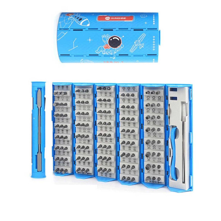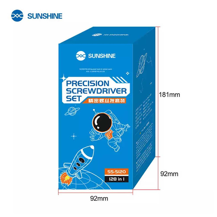 پیچ گوشتی سانشاین SS-5120 – یک پکیج پیچگوشتی بسیار کاربردی 128 تکه با 120 عدد سری مختلف مگنتی است که شما را از داشتن هرنوع پیچگوشتی دیگری در جعبه ابزارتان بینیاز میکند، این محصول دارای باکس جمع شونده و استوانهای شکل است که طراحی خاص و کوچک آن به شما کمک میکند این محصول را به راحتی حمل و استفاده کنید. سریهای مغناطیسی این مجموعه از آلیاژ فولاد بسیار مقاوم S2 هستند و به دلیل داشتن مقاومت سختی 60HRC طول عمر یسیار بالایی دارند. این ست پیچگوشتی برای تعمیرات انواع گوشی، تبلت، دوربینهای دیجیتال، قطعات کامپیوتر و دستگاههای مشابه کاربرد دارد.